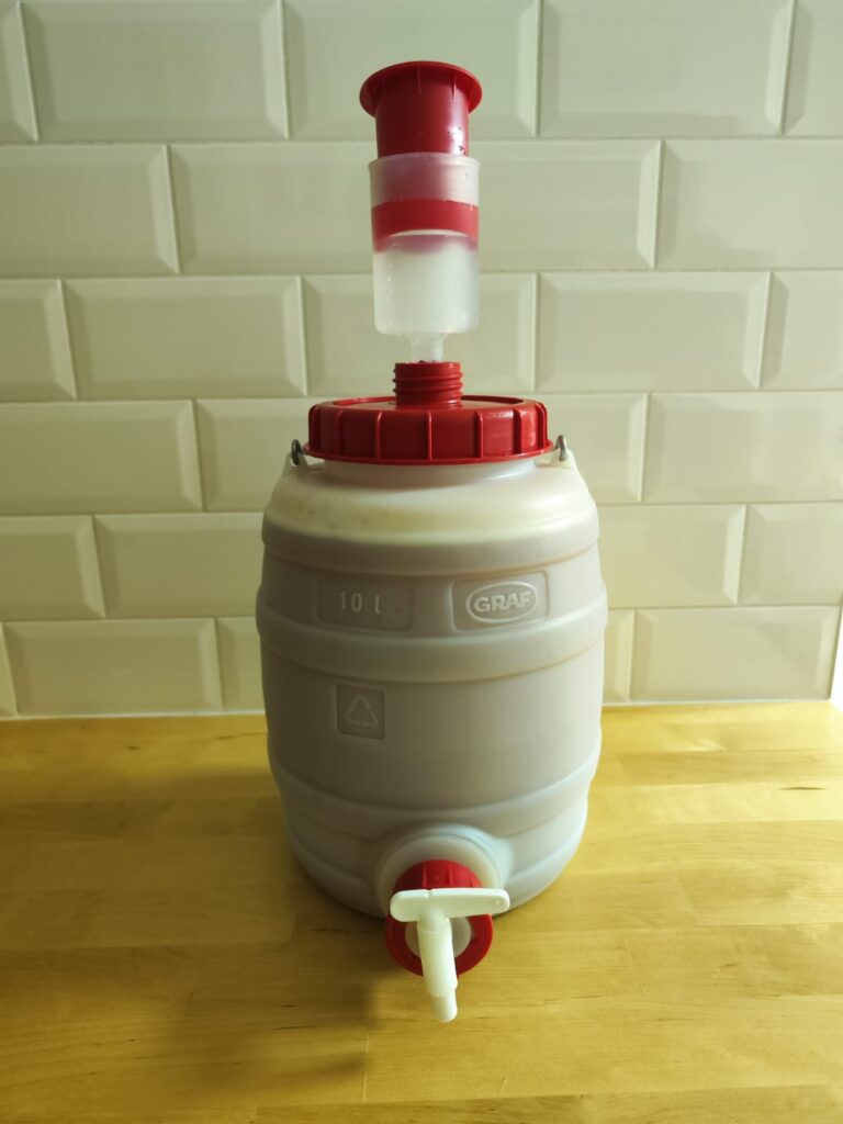 Der Saft kommt in einen besonderen Topf, der mit einem Deckel und einem „Gärspund“ verschlossen wird. Das ist ein Röhrchen mit Wasser, das Luft draußen hält.
