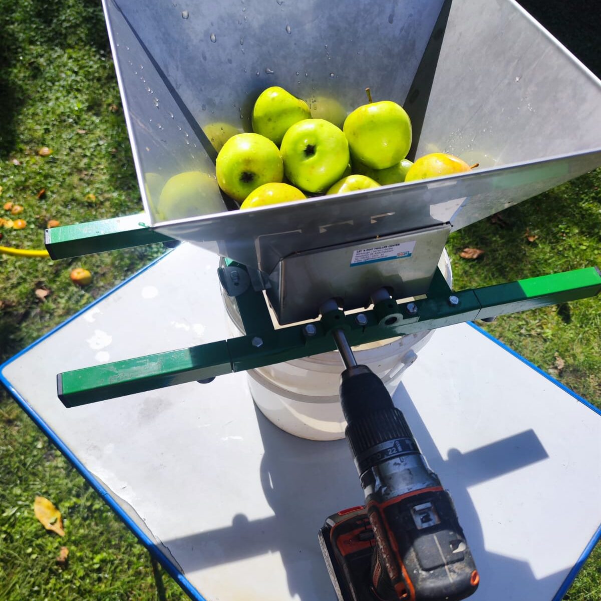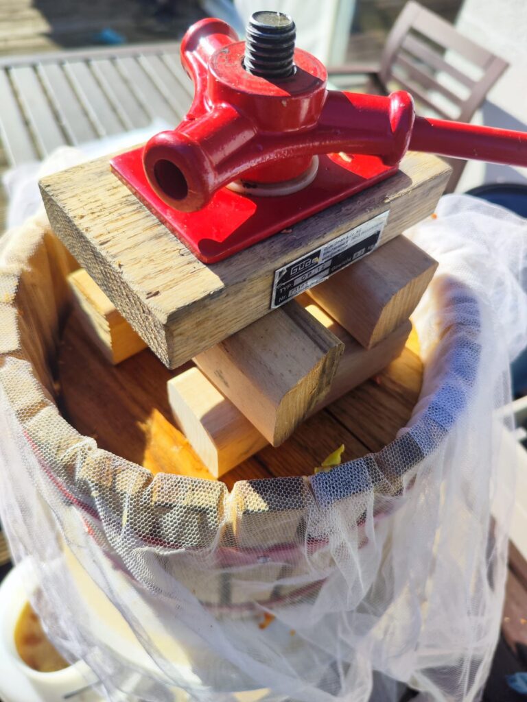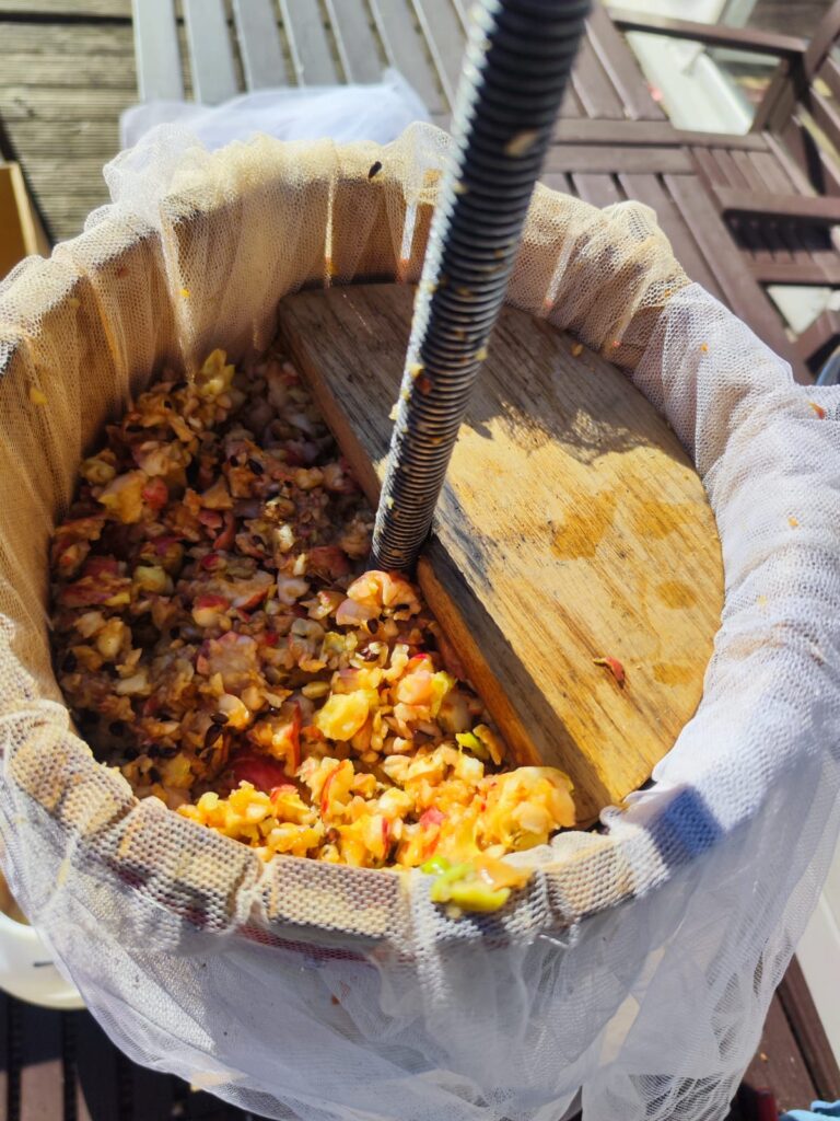 Aus den Apfelstücken pressen wir mit einer Apfelpresse Saft heraus.