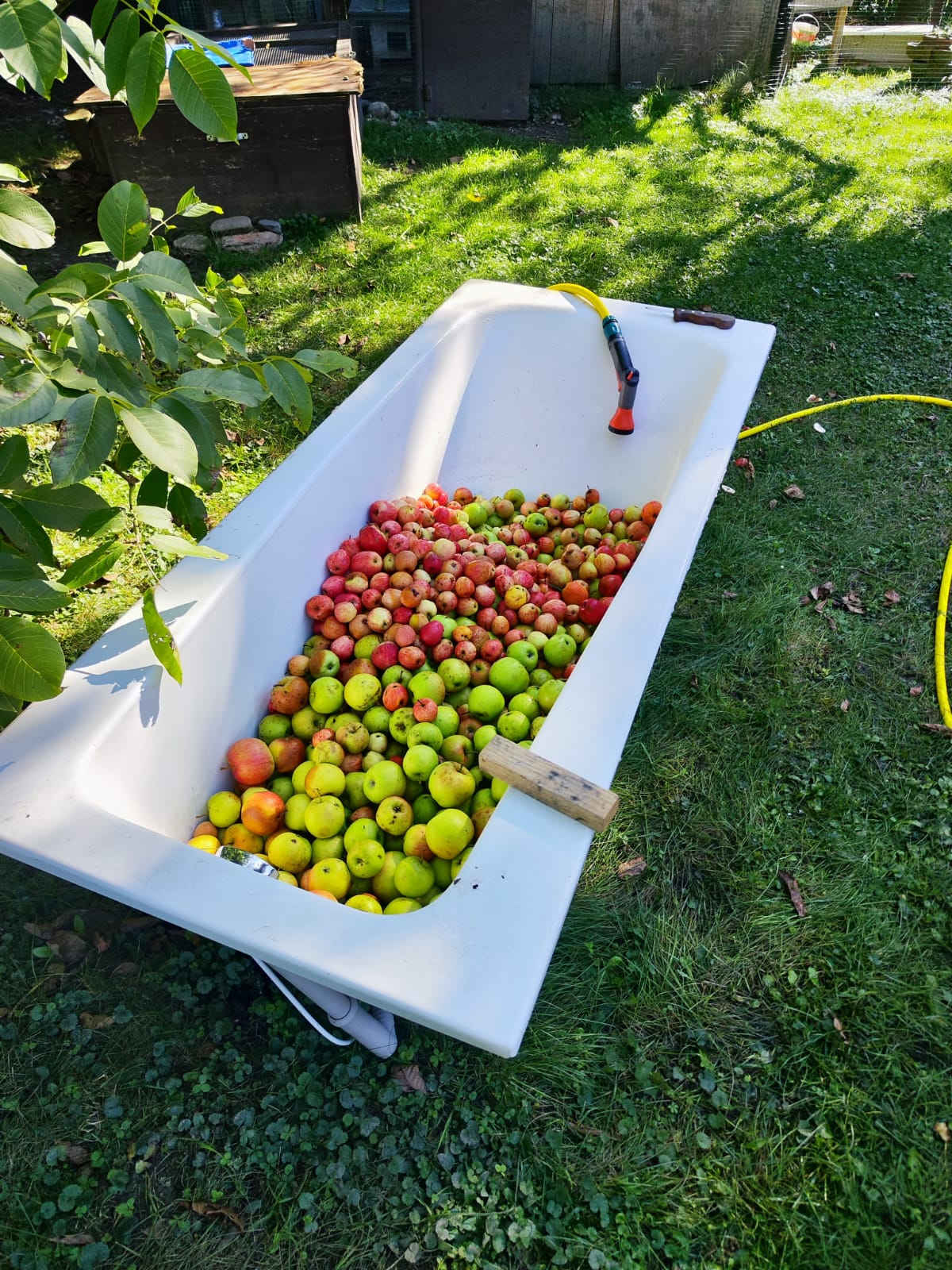 Bevor wir sie benutzen, werden die Äpfel gewaschen – damit kein Schmutz mehr dran ist.