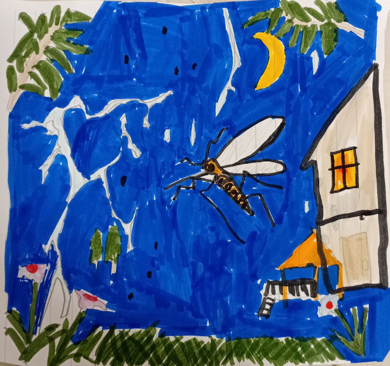 Auf einmal lief eine große Kreatur an mir vorbei. Ich erschrack und wich rasch aus als plötzlich ein seltsames Gefühl zu spüren war. Mein Instinkt führte mich zu den riesigen Kreaturen die an mir vorbeiliefen. Sie hatten zwei Beine, zwei Arme aber weder Flügel noch einen Rüssel im Gesicht. Schließlich, flog ich vorsichtig auf den Nacken des Wesens. Ich stach in die Haut und trank das Blut der riesigen Kreatur. Jetzt habe ich verstanden, wofür dieser nervige lange Rüssel in meinem Gesicht ist, und das Gefühl war verschwunden.