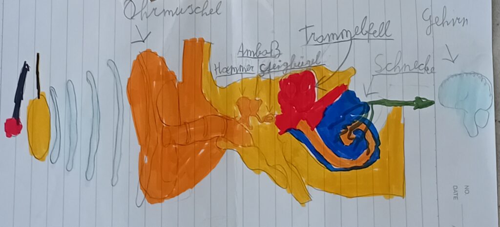 Doch wir sind ebenso auch Schallempfänger. Da kommen unsere Ohren ins Spiel. Wenn wir Schall wahrnehmen, beginnt unser Trommelfell zu schwingen. Diese Schwingungen werden zu den Gehörknöchelchen übertragen. Diese Gehörknöchelchen sind drei Knochen, der Hammer, der Amboss und der Steigbügel. Dann werden die Schwingungen der Knöchelchen an die Flüssigkeit von der Schnecke weitergegeben. Dort befinden sich kleine Härchen, die diese Schwingungen aufnehmen und an das Gehirn weiterleiten.