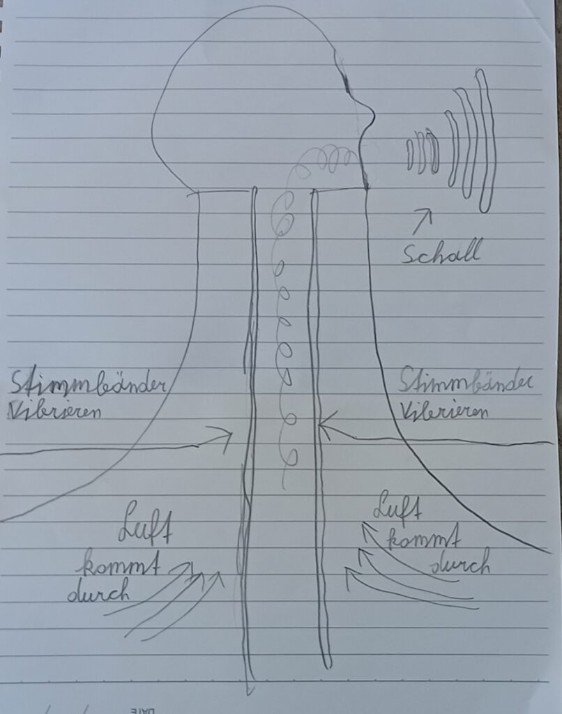 Wir sind Schallsender und haben Stimmbänder. Unsere Stimmbänder sind zwei elastische Bänder. Wenn wir sprechen, fliegt Luft durch unsere Stimmbänder. So werden die Stimmbänder in Bewegung gebracht und es entstehen Schwingungen.