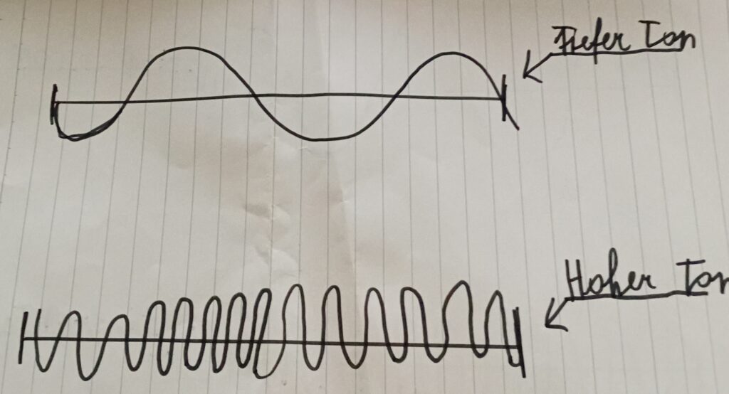 Ob ein Ton hoch oder tief klingt, hängt von der Frequenz ab. Je weniger Hz je tiefer der Ton und je mehr Hz je höher der Ton.