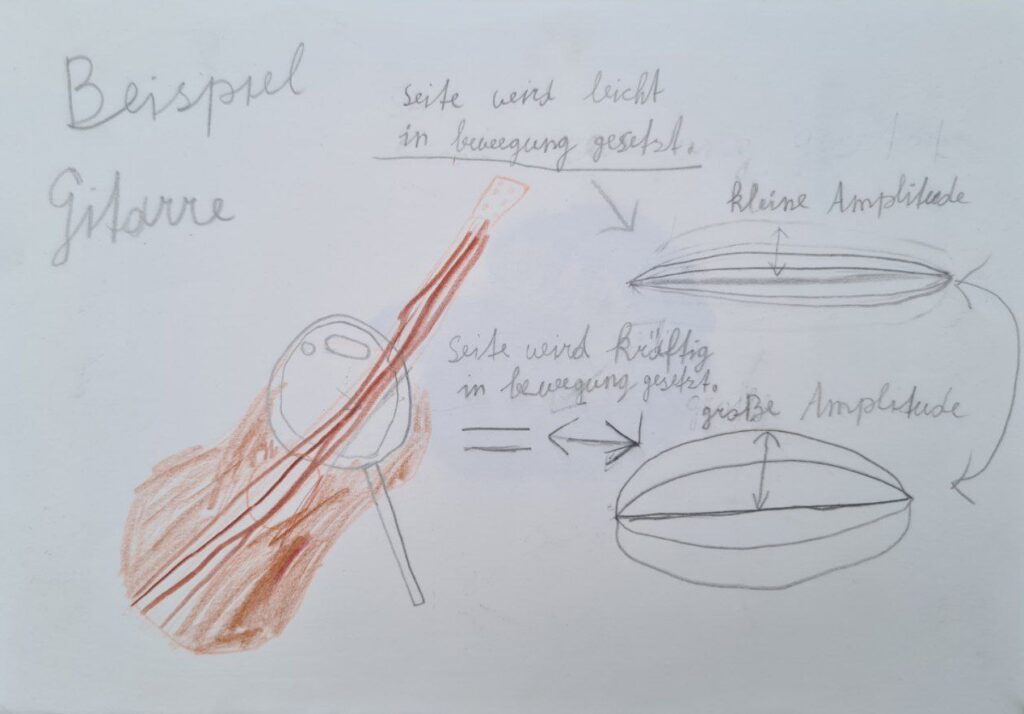 Man kann es sich so vorstellen, dass man bei einer Gitarre die Saite zupft, so wird die Saite in Bewegung gebracht und es entstehen Schwingungen. Je stärker man die Saite zupft, je lauter wird der Ton. Dies ist dann eine große Amplitude. Doch wenn man die Saite locker zupft, ist es eine kleine Amplitude.