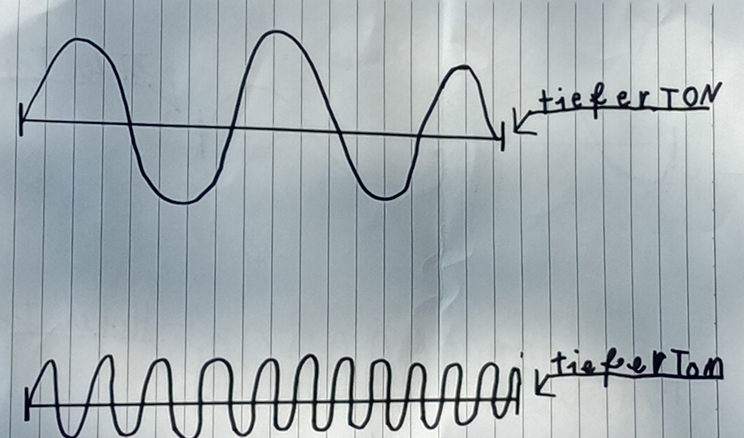 Ob ein Ton hoch oder tief klingt, hängt von der Frequenz ab. Je weniger Hz je tiefer der Ton und je mehr Hz je höher der Ton.