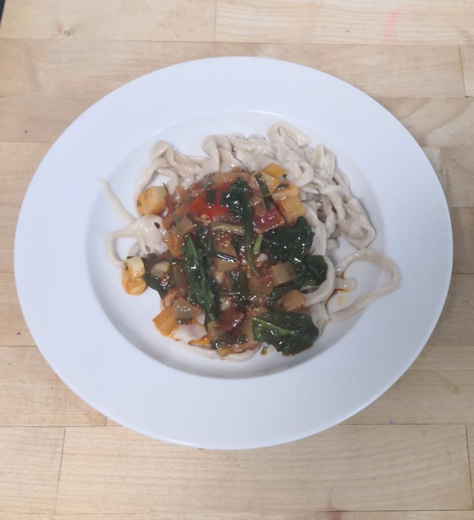 Dort gibt es zum Beispiel Lagman. Lagman ist ein Gericht, das aus Fleisch, Paprika und selbst gemachten Nudeln besteht.