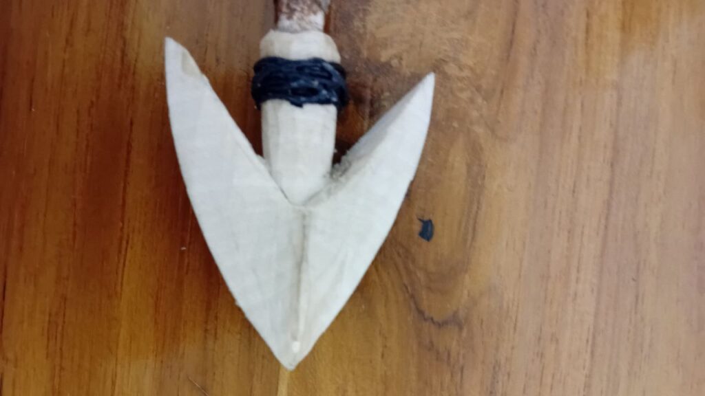 Das ist eine Pfeilspitze die zwei Wiederhaken hat. Ich nenne sie auch Schwalbenschwanz-Spitze, da die Pfeilspitze so ausschaut wie eine fliegende Schwalbe.