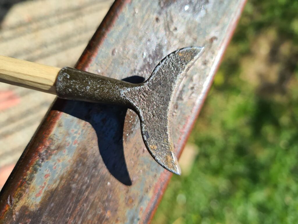 Das ist eine Mondgeformte Pfeilspitze aus dem Mittelalter. Sie wurde, Gerüchten zufolge, benutzt um Seile durchzuschiessen. Das lässt sich nur bewahrheiten wenn man es selber ausprobiert, und man merkt, dass das sehr viel Zielgenauigkeit benötigt.