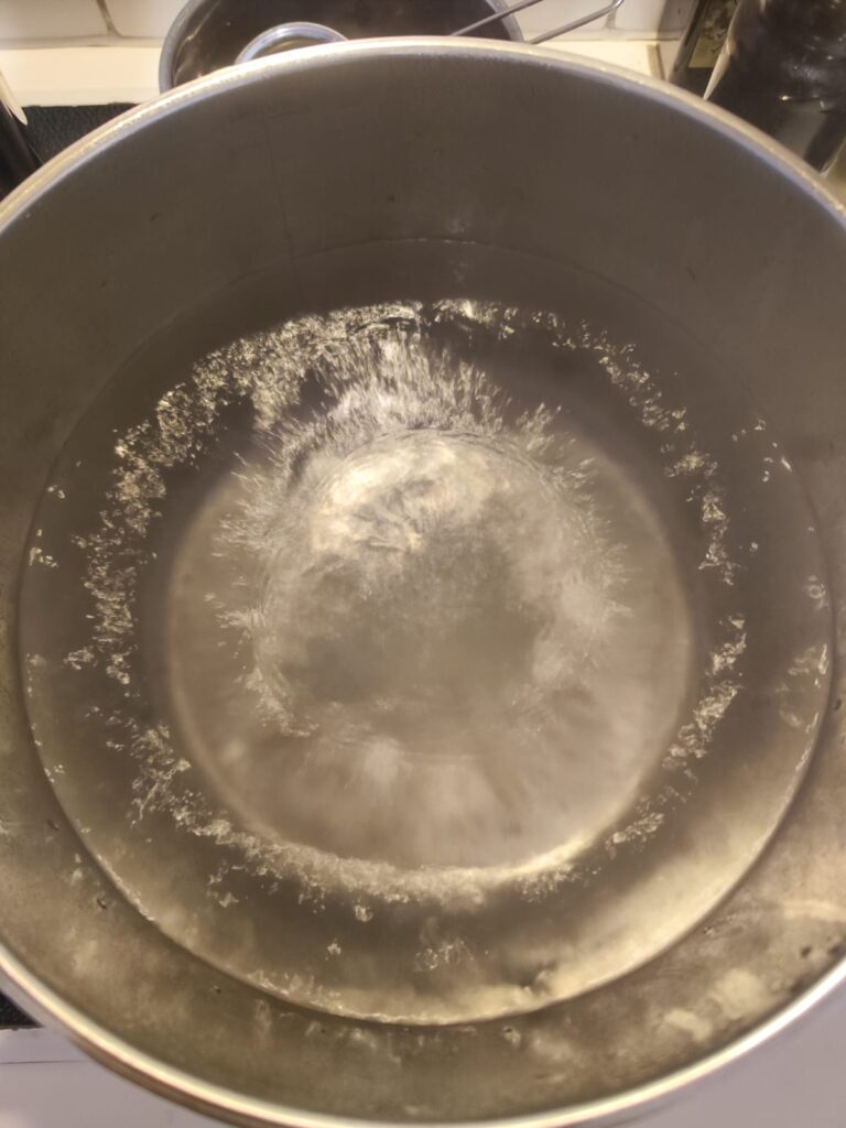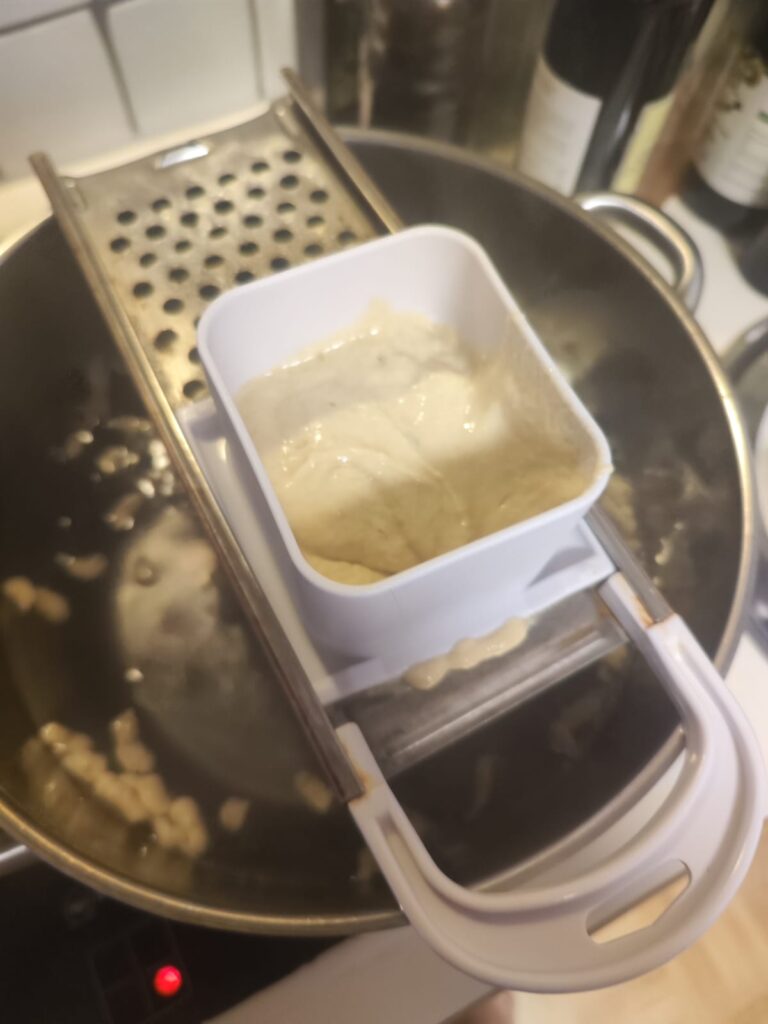 - Danach einen (großen) Topf mit Salzwasser aufkochen und die Spätzle mit Hilfe einer Spätzle-Hobel oder eines Spätzle-Siebes langsam in das kochende Wasser gleiten lassen. Falls weder das eine noch das andere vorhanden ist, kann der Teig auch von einem Schneidbrett Stück für Stück ins Wasser geschoben werden.