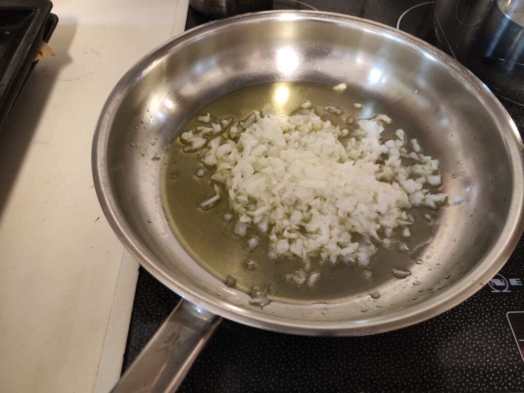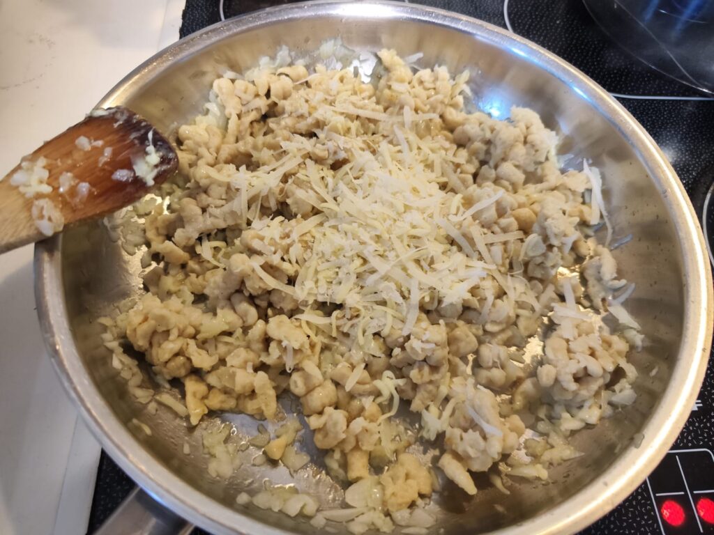 - In einer großen Pfanne das Öl erhitzen und die gehackten Zwiebel goldbraun werden lassen und anschließend die Spätzle hinzufügen.