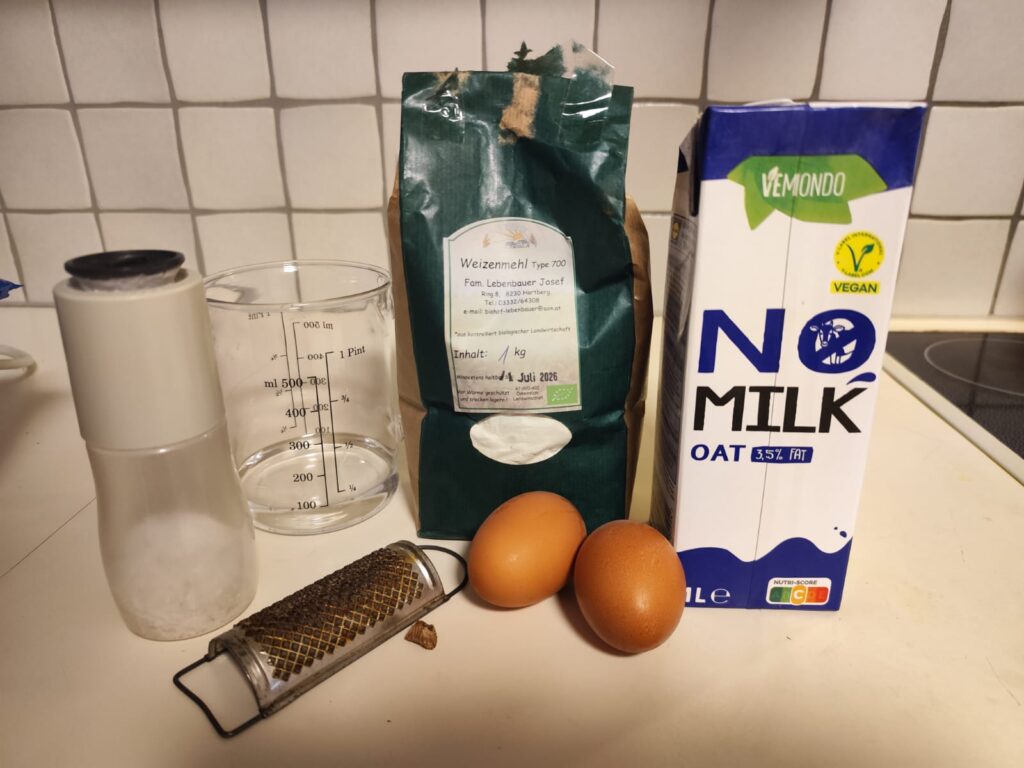 - Das Weizenmehl in eine Schüssel geben. In der Mitte des Weizenmehls mit einem Löffel eine Vertiefung formen und in diese Vertiefung die Eier, Wasser und das Salz geben. Entweder mit der Hand oder einem Rührgerät den Teig solange rühren bis er zu ein zähflüssiger Teig entsteht.