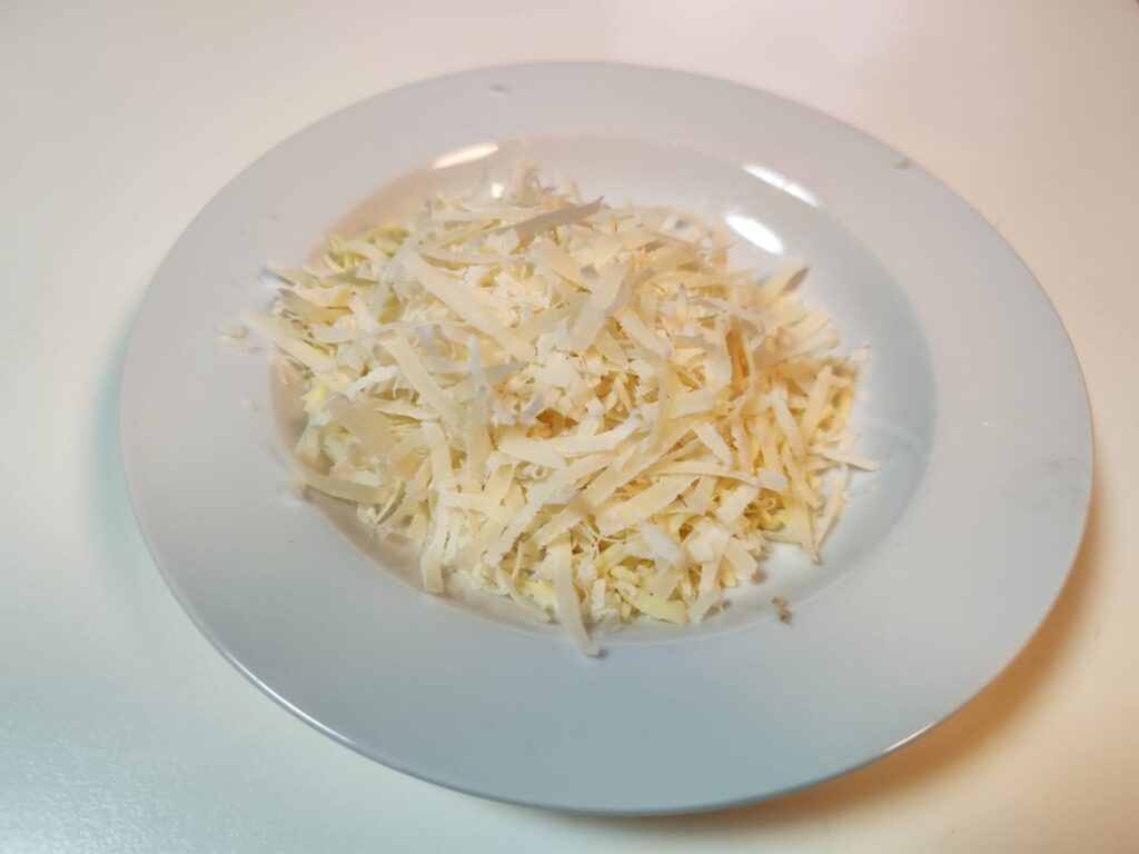 - Dann geriebenen Bergkäse hinzufügen, mit Salz und Pfeffer würzen.